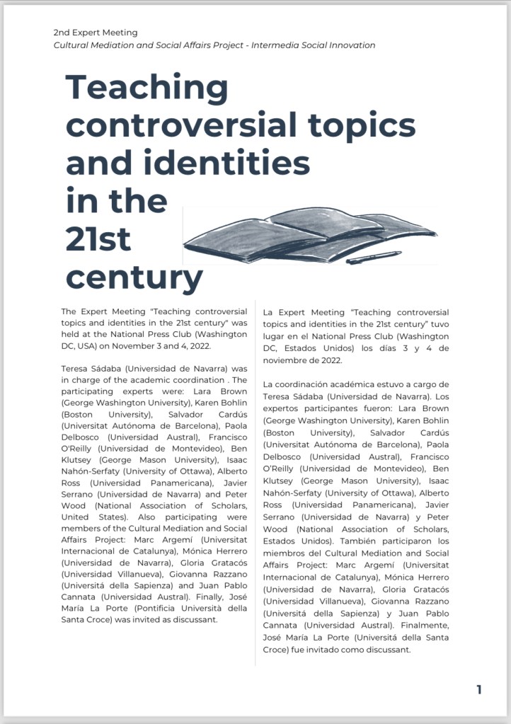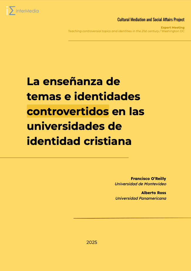 El proyecto Cultural Mediation and Social Affairs de Intermedia Social Innovation reunió a varios expertos en Washington, para que desde distintas perspectivas políticas, sociales y culturales, definieran un diagnóstico y ofrecieran propuestas y orientaciones para la enseñanza de temas controvertidos y la mejora de la educación en la sociedad de la controversia. El diagnóstico, rico en matices, definió un punto de partida: la controversia, aunque incómoda, es necesaria e inevitable en la sociedad y en la vida concreta de cada persona para reconstruir y actualizar el vínculo social, para evitar que las tensiones degeneren en violencia y para propiciar el bien común, que permite los bienes personales de todos.